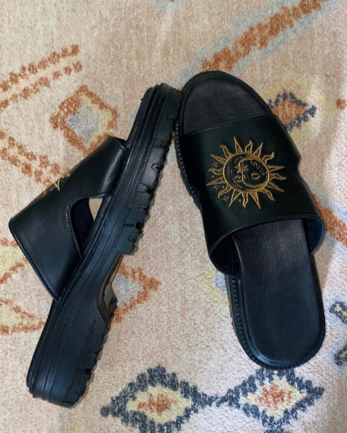 Leather sandal with side cutouts and Moon Sun embroidery