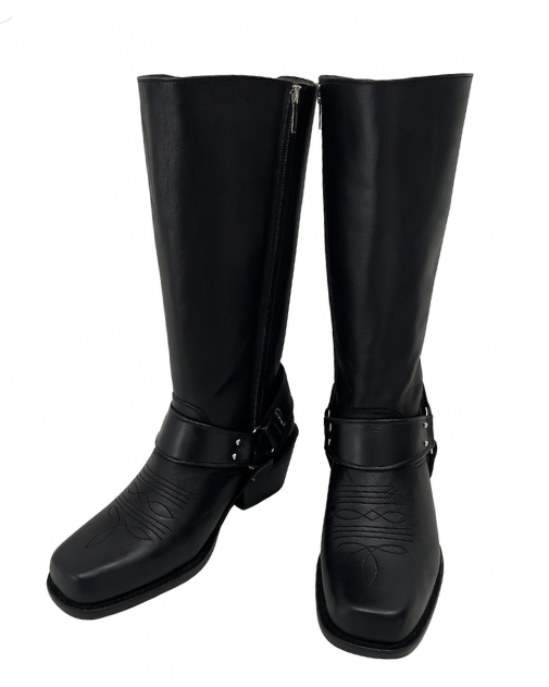 100% leather burgundy high moto boots with metal ring harness and zipper